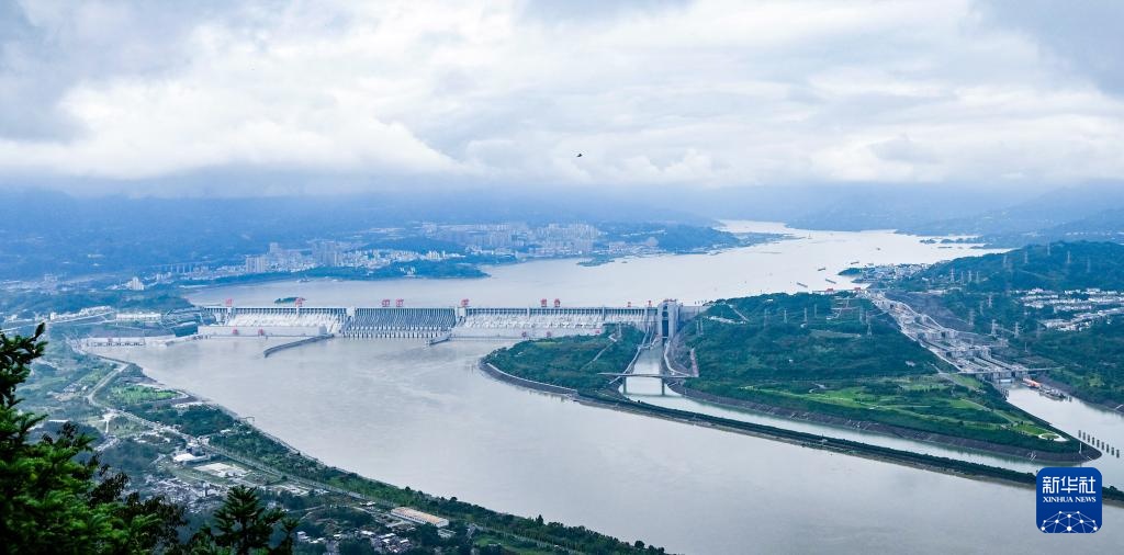连续的降雨停止了,河河Yichang的三户大坝被乌云和雾包围,有着巨大的气氛。
