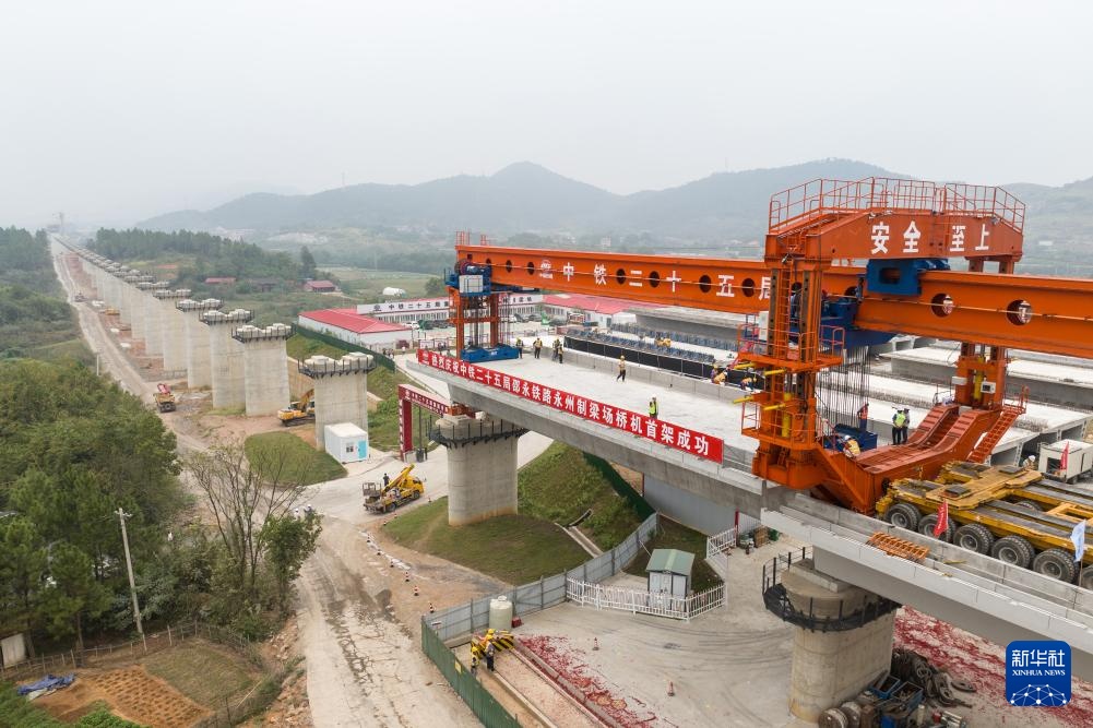 这是10月13日拍摄的芦洪江邵永高铁大桥梁施工现场(无人机照片)。 10月13日,在湖南省永州市邵永高铁跨芦洪河大桥施工现场,长32.6米、重约817吨的箱梁成功架设,标志着中铁二十五局承建的邵阳高铁第三座标准桥正式开工。新铁路已进入上行阶段。 梁施工阶段。少龙高铁全长约96公里,设计时速350公里。是日本呼和浩特至南宁“八纵八横”高铁网的重要组成部分。北接娄底铁路邵阳,南接衡柳铁路。少龙高铁建成后,将对于完善地方铁路网布局、推动中部地区高质量发展具有重要意义。新华社记者陈思涵摄 新版这是10月13日拍摄的少龙高铁跨芦洪河大桥施工现场(无人机照片)。新华社记者陈思涵摄 新版这是10月13日拍摄的少龙高铁跨芦洪河大桥施工现场(无人机照片)。新华社记者陈思涵摄 新版这是10月13日拍摄的少龙高铁跨芦洪河大桥施工现场(无人机照片)。新华社供图 陈思涵 分页 10月13日,中铁二十五局的工人在芦洪河上少龙高铁大桥主梁施工现场作业。新华社供图cy,陈思涵 PAGE BREAK 10月13日,中国铁路二十五局的工人在芦洪河上的少龙高铁大桥主梁施工现场进行作业。新华社记者陈诗涵供图。