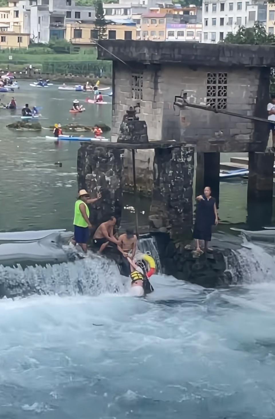 一位游客掉进了一个柔软的水坝,被村民救出。